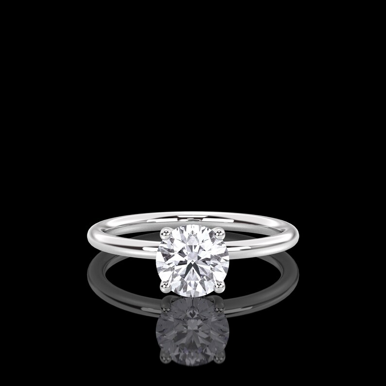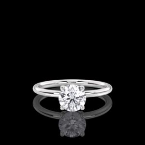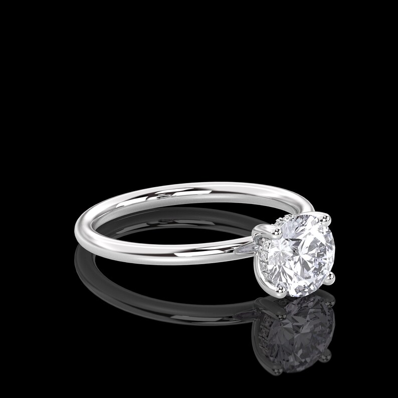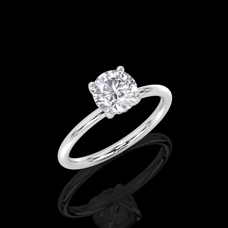 This 1.15ctw lab-grown Round Brilliant Cut E color and VS1 clarity Prong-set diamond engagement ring. With a hidden diamond halo mounted in a solid 14kt White Gold round wire mounting. This piece of jewelry was handcrafted and is suitable for any occasion. Whether it be a wedding, anniversary, birthday, or just a beautiful gift. This ring is made to last and is coupled with a beautiful jewelry box.