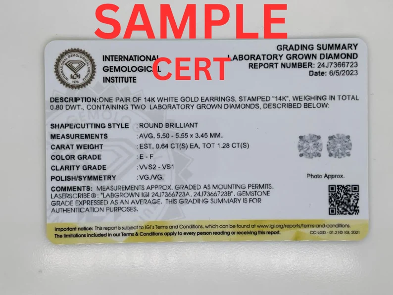 This 1.21ctw lab-grown in E-F color and VVS clarity and is IGI Certified. These pair of studs are set in a solid 14kt gold 4 prong martini setting. This piece of jewelry was handcrafted and is suitable for any occasion. Whether it be a wedding, anniversary, birthday, or just a beautiful gift. These studs are made to last and are coupled with a beautiful jewelry box.