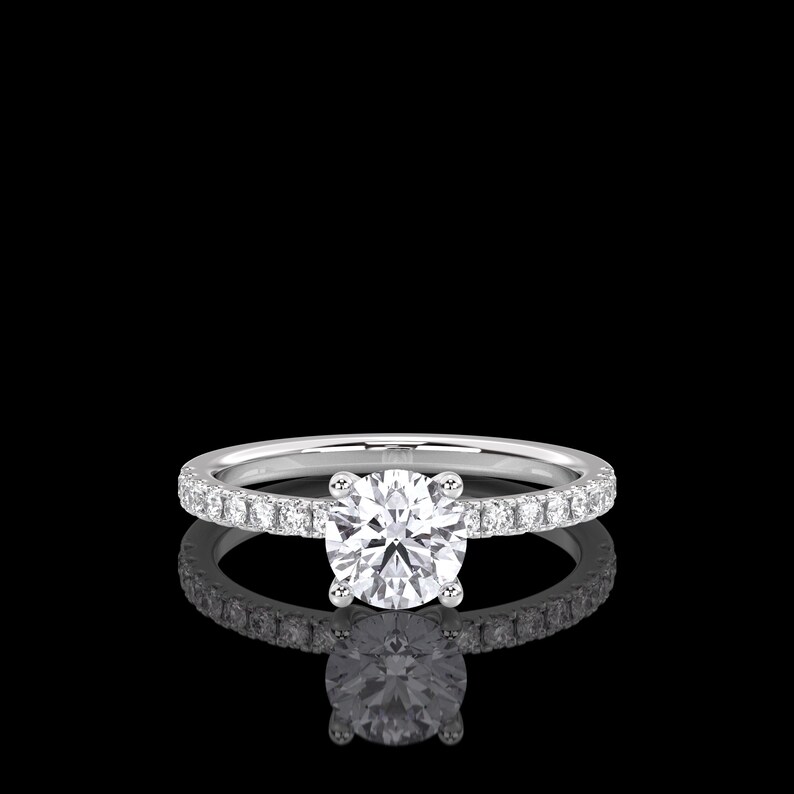 This 1.25ctw lab-grown Round Brilliant Cut E color and VS1 clarity Prong-set center and a Pave set diamond hidden halo engagement ring. In a solid 14kt White Gold ring. This piece of jewelry was handcrafted and is suitable for any occasion. Whether it be a wedding, anniversary, birthday, or just a beautiful gift. This ring is made to last and is coupled with a beautiful jewelry box.