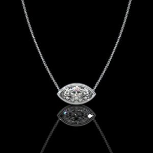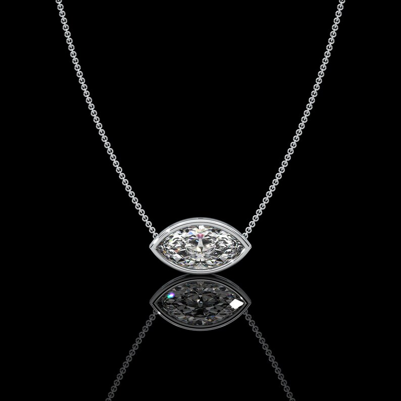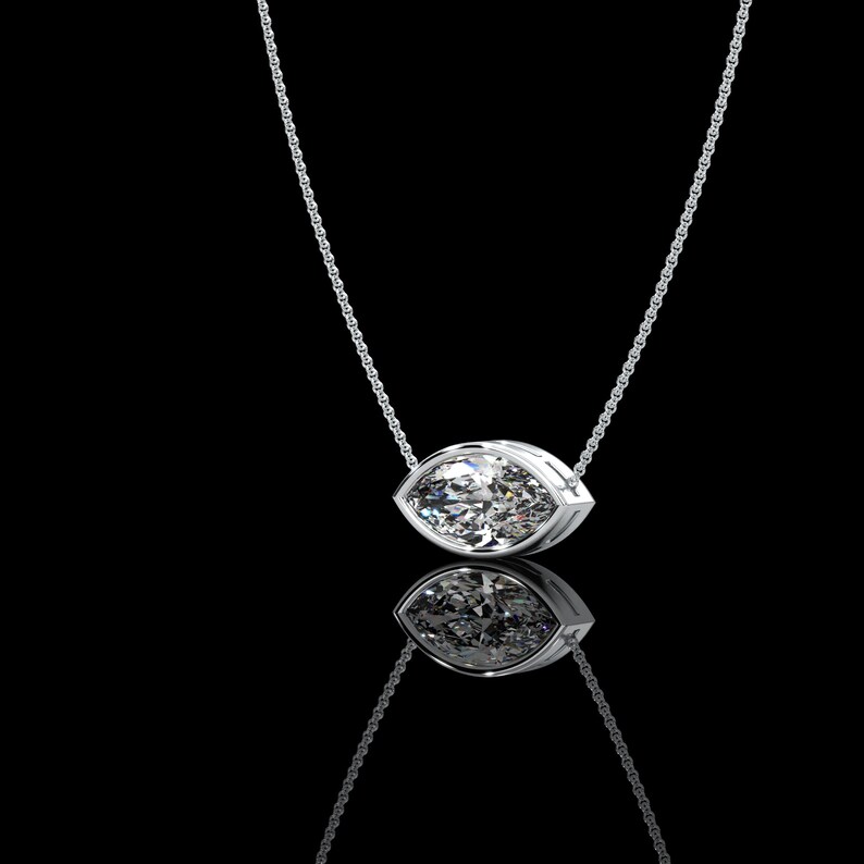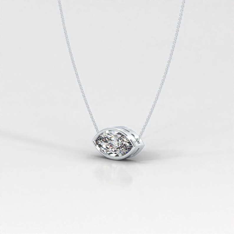 This is a 1-5 ctw lab-grown Marquise sideways E in color and VS1 in clarity diamond bezel set pendant. This piece of jewelry was handcrafted and is suitable for any occasion. Whether it be a wedding, anniversary, birthday, or just a beautiful gift. This pendant is made to last and comes with a beautiful jewelry box.