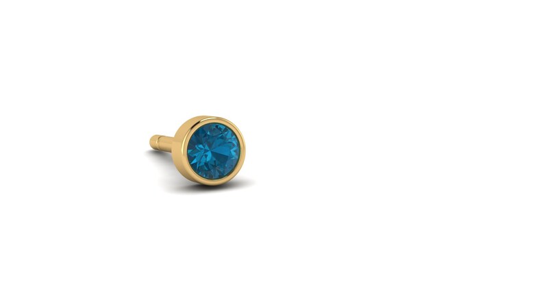 A 1/2 pair of genuine petite round London Blue Topaz creates this bezel set stud in solid 14k solid gold. Great for stacking, worn individually or paired with other types of stud or hoop earrings. As in all our jewelry, these earrings are made to order in our factory in New York City. The picture has been enlarged to show detail.