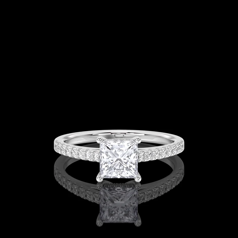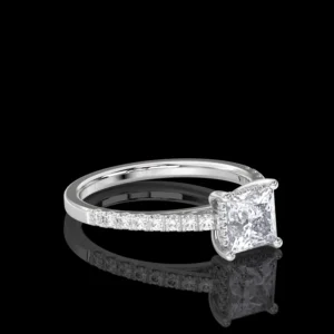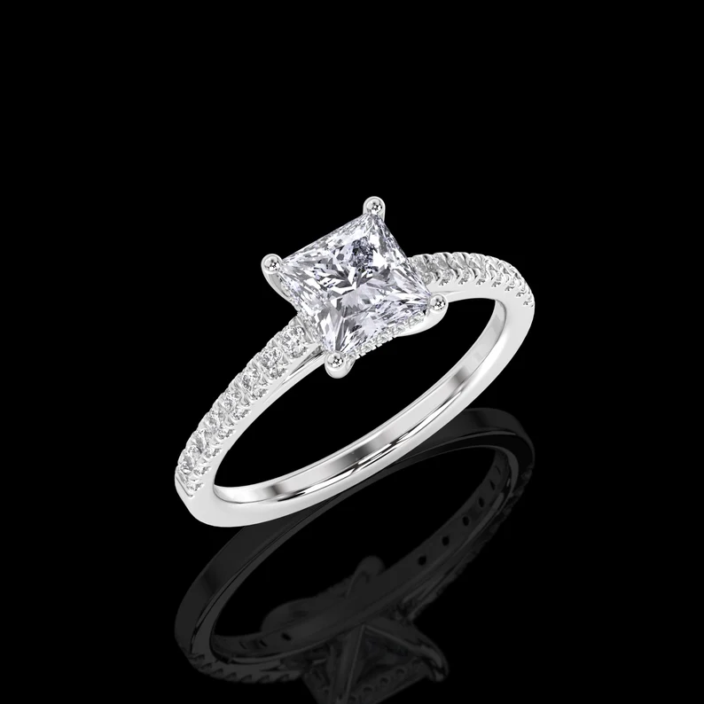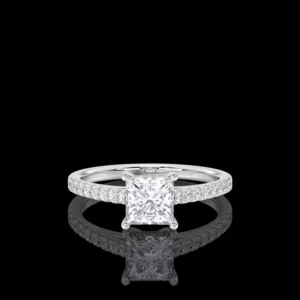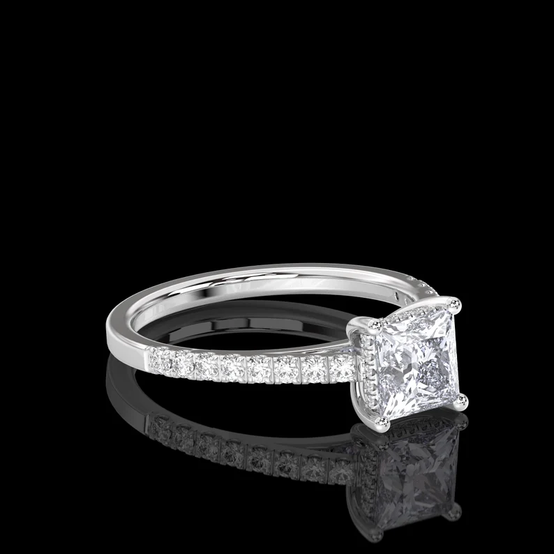 This 1.30ctw lab-grown 4 prong Platinum Princess Cut E color and VS1 clarity pave set diamond engagement ring. In a solid 950 Platinum ring. This piece of jewelry was handcrafted and is suitable for any occasion. Whether it be a wedding, anniversary, birthday, or just a beautiful gift. This ring is made to last and is coupled with a beautiful jewelry box.
