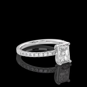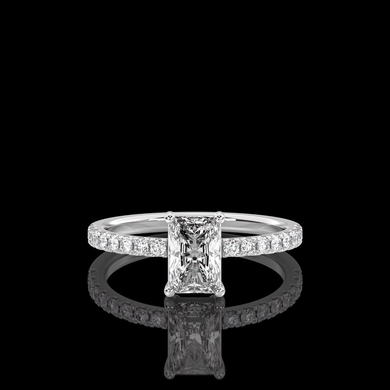 This 1.33ctw lab-grown 4 prong Platinum Radiant Cut E color and VS1 clarity pave set diamond hidden halo engagement ring. In a solid 14kt White Gold ring. This piece of jewelry was handcrafted and is suitable for any occasion. Whether it be a wedding, anniversary, birthday, or just a beautiful gift. This ring is made to last and are coupled with a beautiful jewelry box.