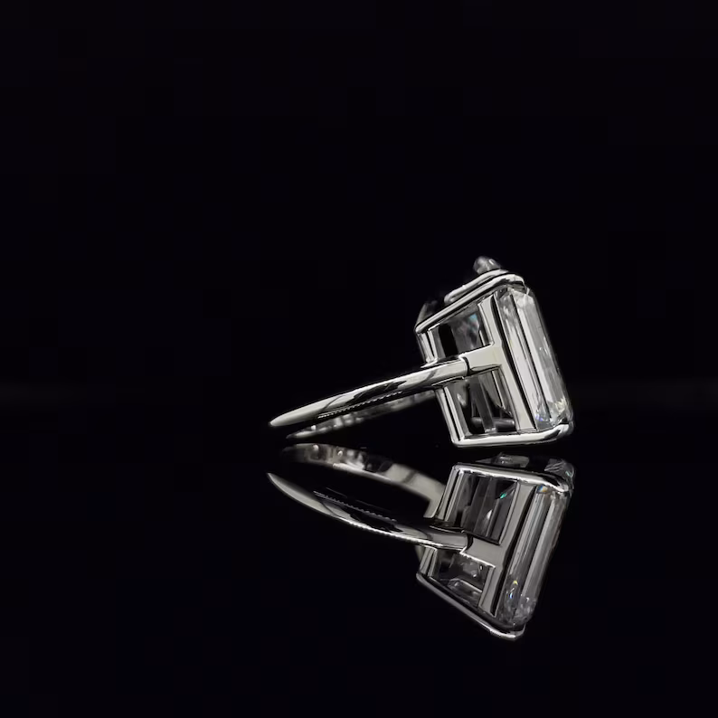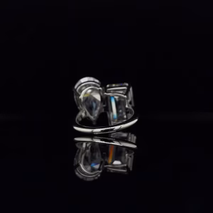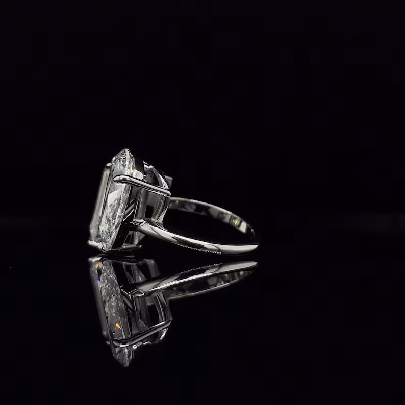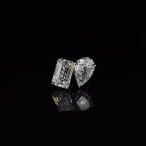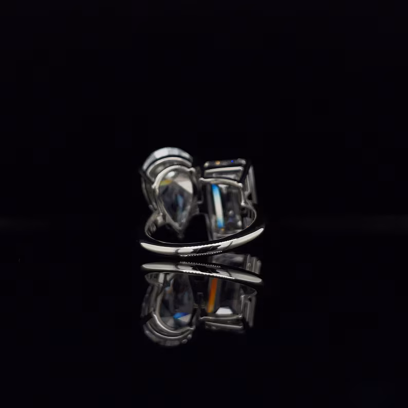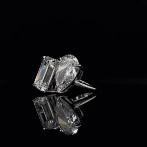 This exquisite Toi et Moi engagement ring showcases two equally remarkable lab-grown diamonds: a 5-carat emerald-cut and a 5-carat pear-shaped cut, delicately secured in position by claw prongs. The Toi et Moi style signifies the coming together of two people, and in this particular design, the fusion of the unique emerald and pear cuts forms a beautifully balanced and enchanting symbol of love and togetherness. The inclusion of claw prongs enhances the overall elegance of the piece, adding a refined touch to its aesthetic.